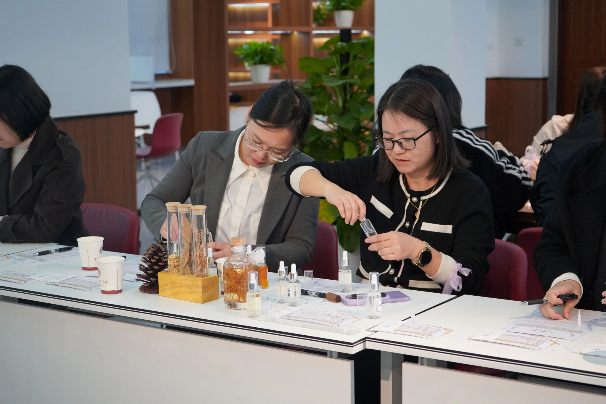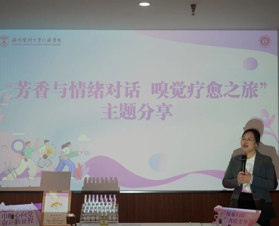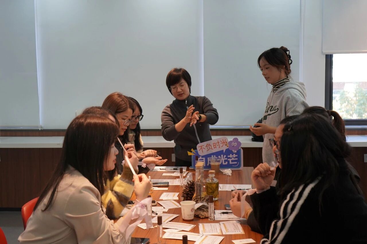 专业芳香师以“芳香与情绪对话”为主题,结合香气疗法,讲解了如何通过嗅觉疗愈改善情绪、平衡身心。在“芳香沁心”精油DIY体验中,女教职工们在指导下亲手制作个性化香薰产品,在芬芳中舒缓压力、感受身心平衡的愉悦。