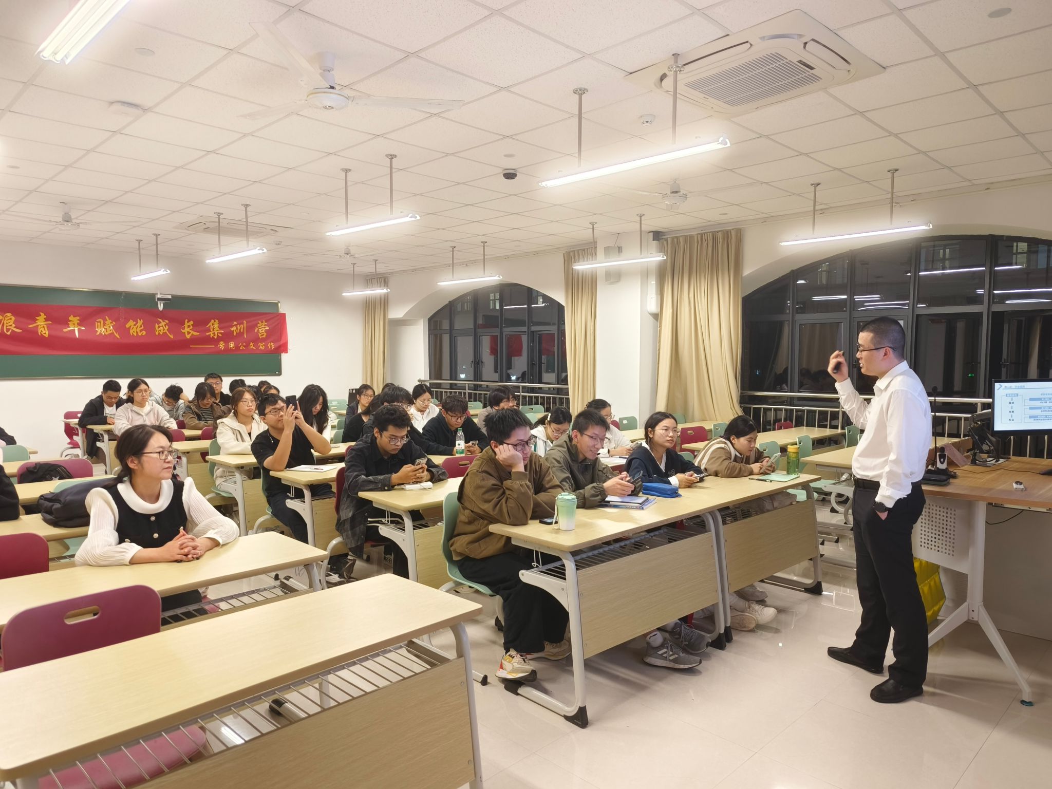 王老师在讲座中与同学们也分享了日常练习的方法,从逻辑出发,结合同学们的生活实际来分析,由浅入深,同学们受益匪浅。其中有同学表示:“通过这次培训,我学会了如何撰写清晰、简洁、有效的公文。培训中,我了解了不同类型的公文格式和写作风格,并学会了如何选择适当的词汇和句式来表达自己的意思。这次公文培训不仅增强了我的写作能力,也提升了我的沟通和表达能力,在工作和生活中都能够受益匪浅”。
