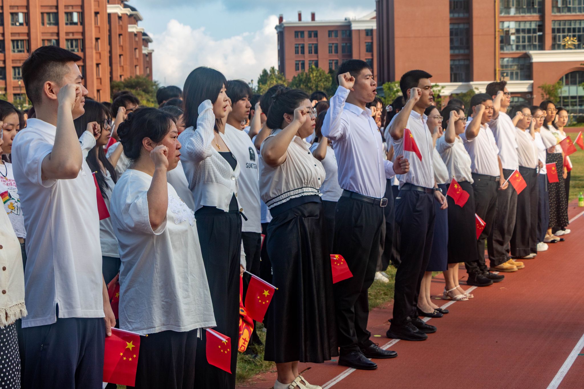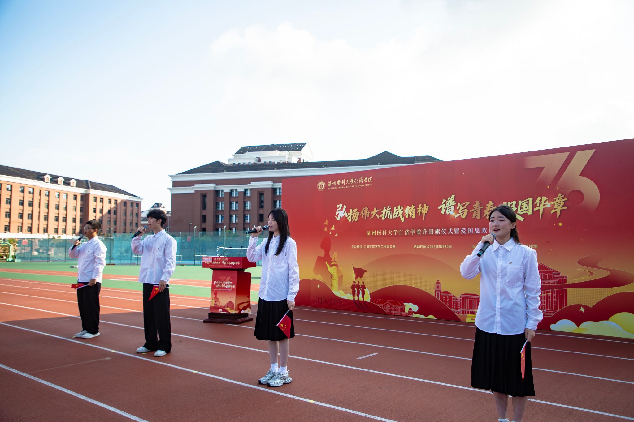 为庆祝中华人民共和国成立76周年,弘扬伟大抗战精神,激励青年学子坚定理想信念、勇担时代使命,2025年9月30日清晨,av解说 在滨海校区操场隆重举行“弘扬伟大抗战精神,谱写青春报国华章”升国旗仪式暨爱国思政课活动。学院领导、辅导员以及学生代表齐聚一堂,现场庄重而热烈。