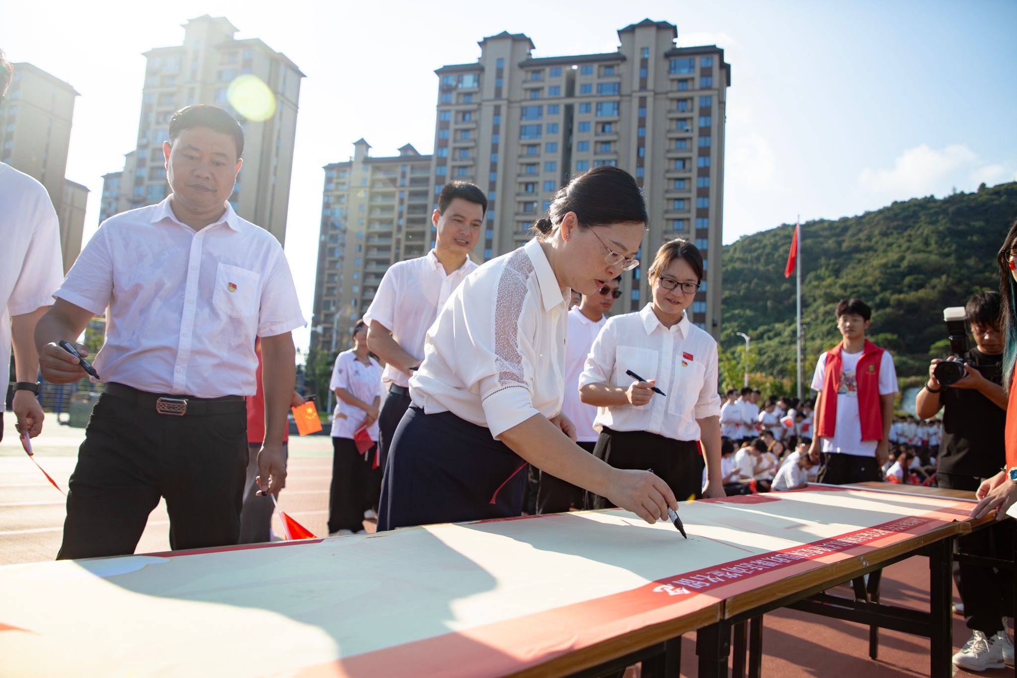 “我爱你中国,亲爱的母亲……”活动的尾声,全场师生挥动着手中的红旗,共同高唱《我爱你中国》。激昂深情的旋律响彻云霄,唱出了对祖国母亲的赤子之心和无限热爱。歌声落下,师生们在“祝福中华人民共和国成立76周年”的签名卷轴上郑重签下自己的名字,深情表达对祖国繁荣昌盛的美好祝愿。