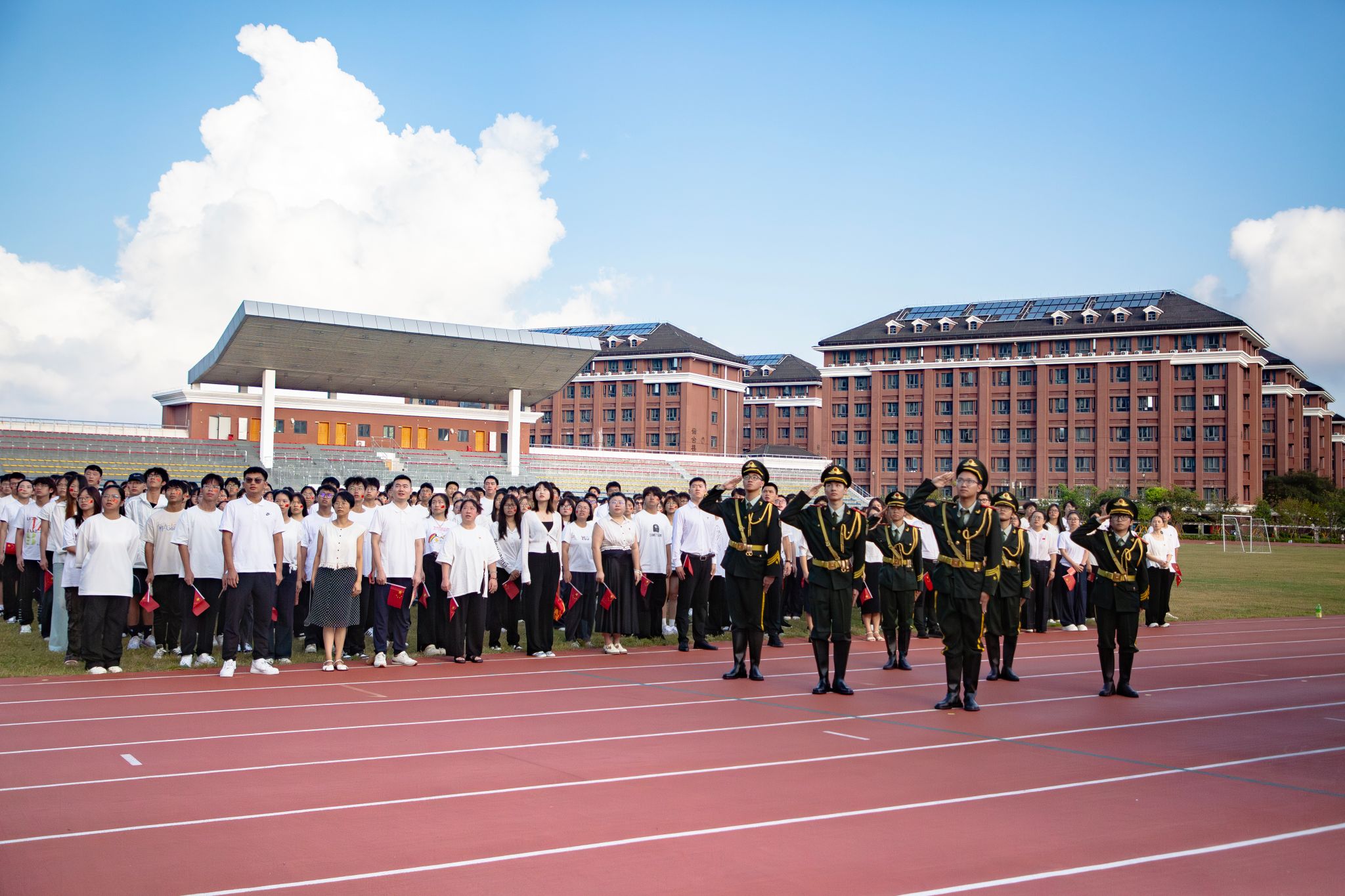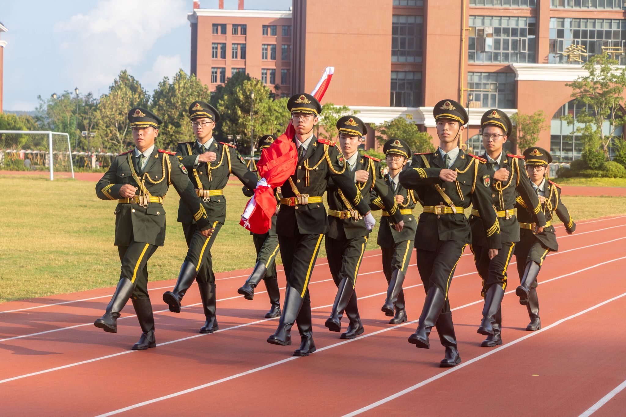 随后,升国旗仪式正式开始,国旗护卫队迈着铿锵有力的步伐护送国旗入场。全体师生肃立,高唱国歌,共同注视着五星红旗冉冉升起,在晨光中迎风飘扬。