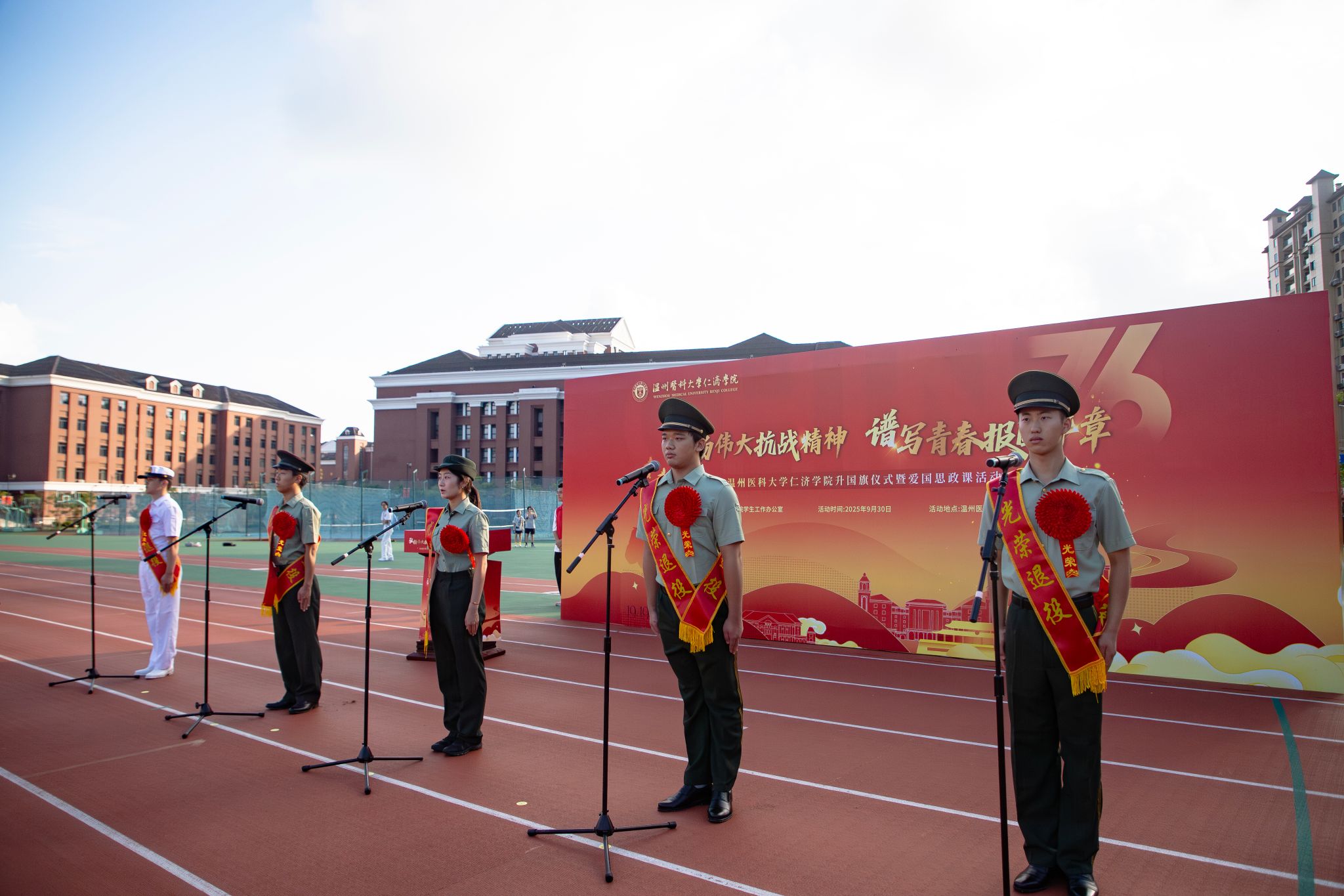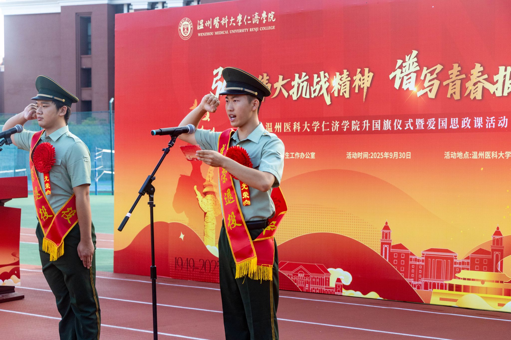 在“国旗下的心里话”环节,五位退役大学生士兵表达了“退伍不褪色”“医路报国”的坚定决心。在退役大学生士兵代表罗浩东同学的带领下,全体同学高举右拳,庄严宣誓:“愿以吾辈之青春,捍卫盛世之中华……请党放心,强国有我!”铿锵誓言回荡在整个校园,展现了仁济学子昂扬的精神风貌与坚定的报国之志。