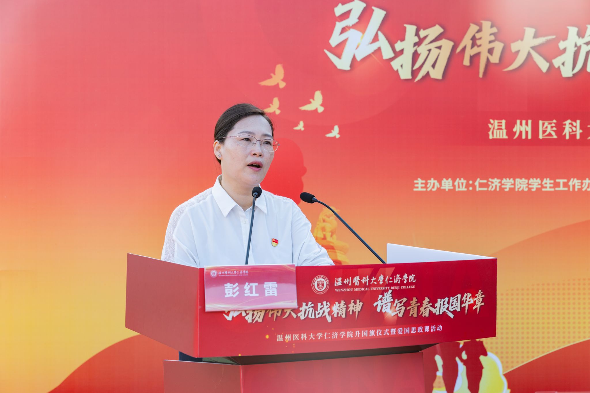 旗帜飘扬,誓言在耳,嘹亮的号角指向了前进的航向。如何将此刻震天的誓言,化为不负时代、不负韶华的奋斗指南?一堂走心入脑的爱国思政课隆重开讲。av解说 党委书记彭红雷围绕“以史为鉴”“以行践诺”“以梦为马”三个层面,深情回顾了抗战历史的壮烈与民族精神的传承,并结合仁济学子奔赴西部、捐献造血干细胞、捐献眼角膜等真实事迹,生动诠释了“仁肃勤朴”“仁心济世”精神在新时代的传承。“新时代医学青年要深挖中华优秀传统文化的精神宝藏,传承弘扬伟大抗战精神”,她寄语广大学子要将爱国情怀熔铸于所学专业的精益求精之中,在奋斗实干中书写青春的爱国华章。