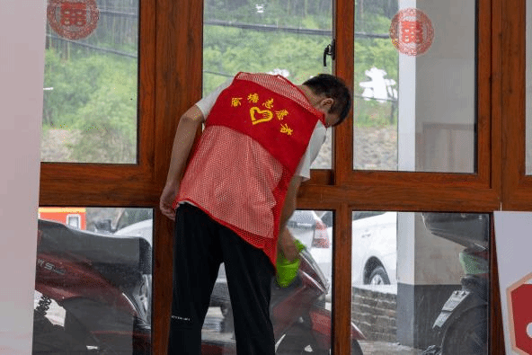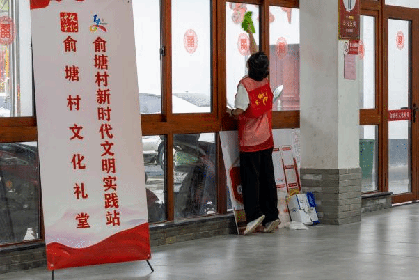 时值湿热交织之际,草木生发,百虫知暑。成员们身穿红马甲,带着抹布、簸箕等清洁工具打扫了俞塘村文化礼堂、乡村菜场和老年协会。
