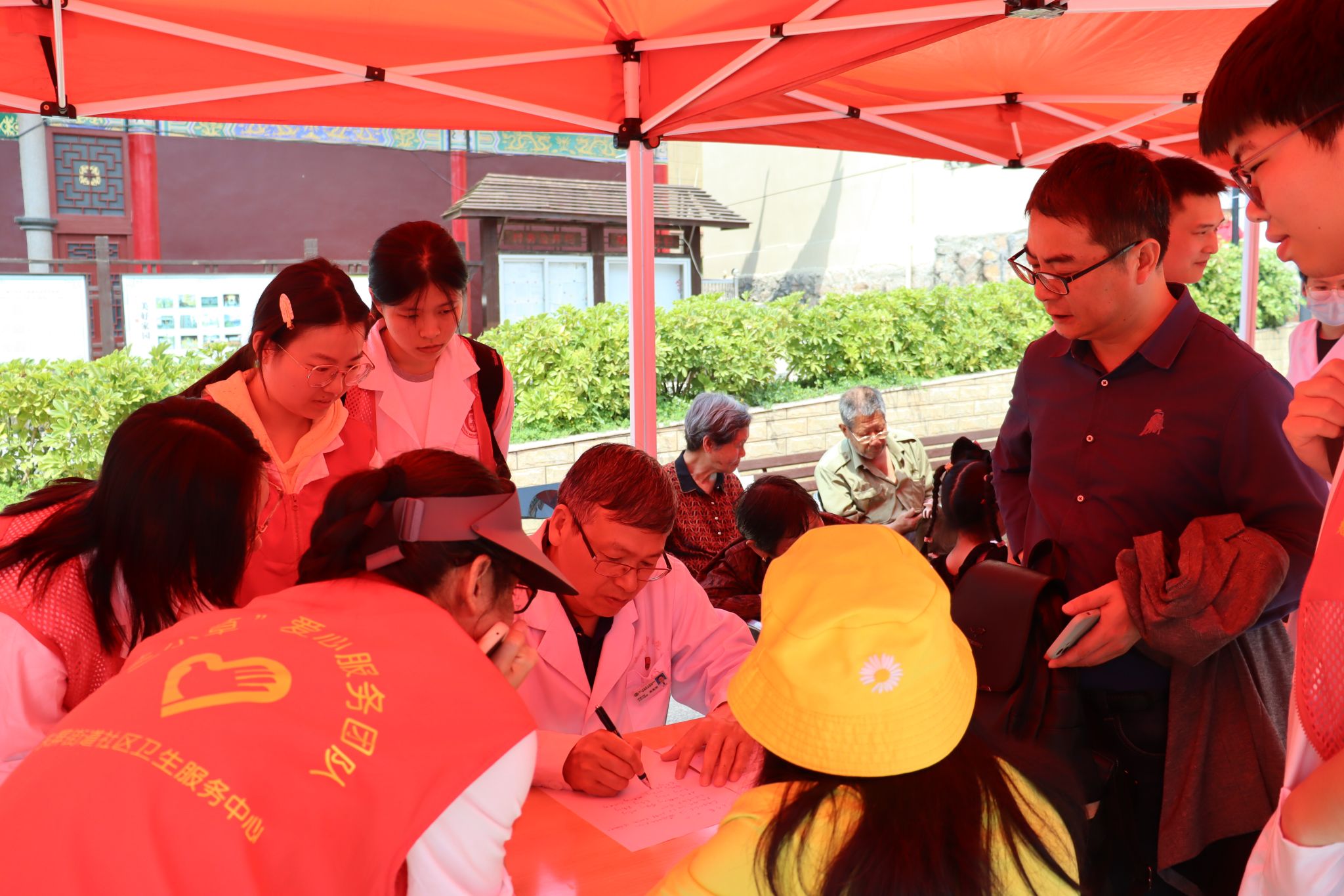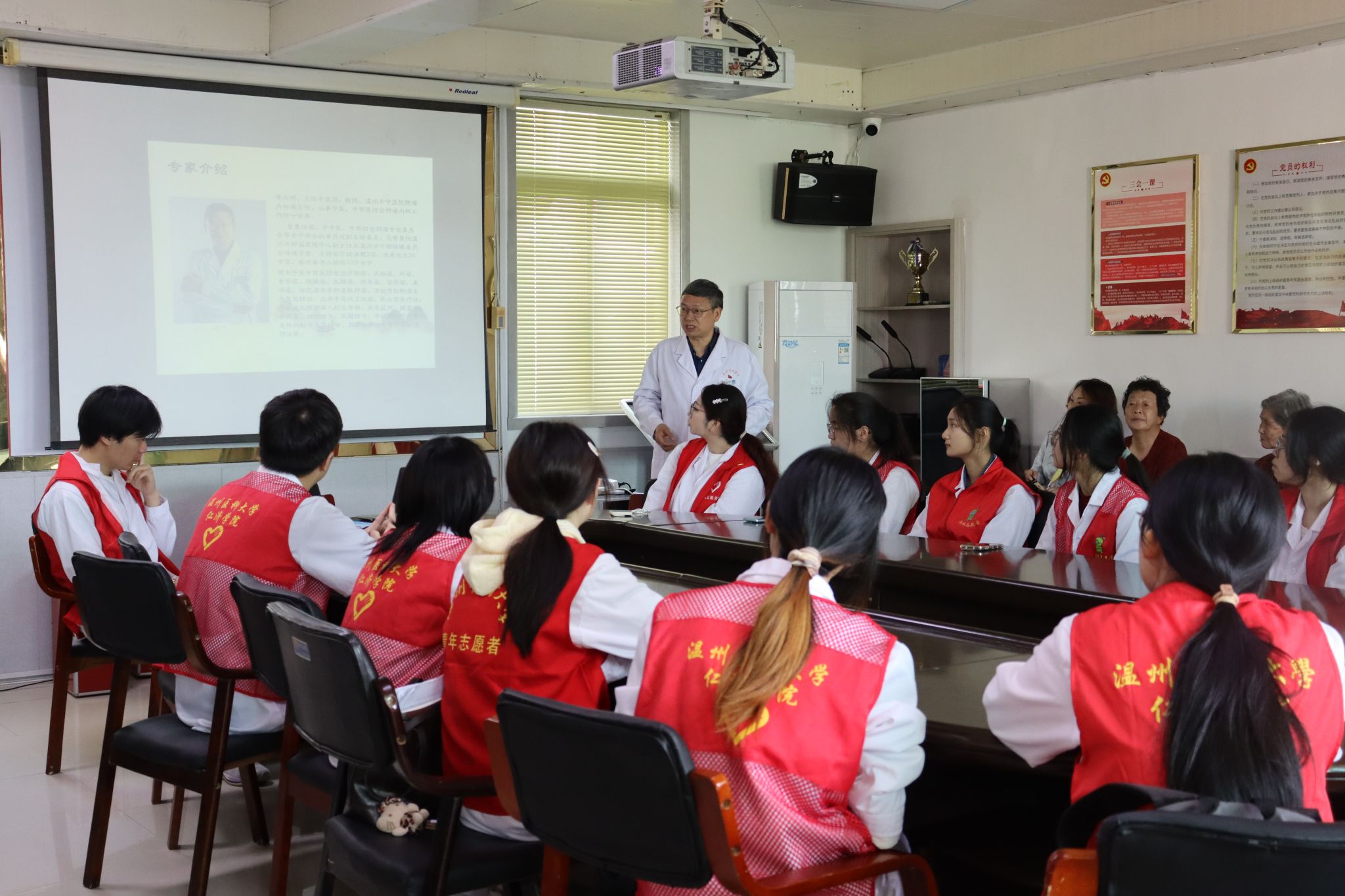 活动伊始,医学三系第一党支部中医学专业的15名志愿者早早来到了中仑村的党群服务中心,紧接着志愿者们引导居民前往科普地点,市中医院黄兆明中医师、陶玉中医师、叶必宏中医师分别以通俗易懂的语言,向居民们系统讲解肿瘤的成因、早期症状及科学防控措施,强调“早筛查”的重要性,普及“早预防、早发现、早治疗”的健康理念。志愿者们也一同学习了肿瘤相关知识,深刻了解了肿瘤宣传周的重大意义。