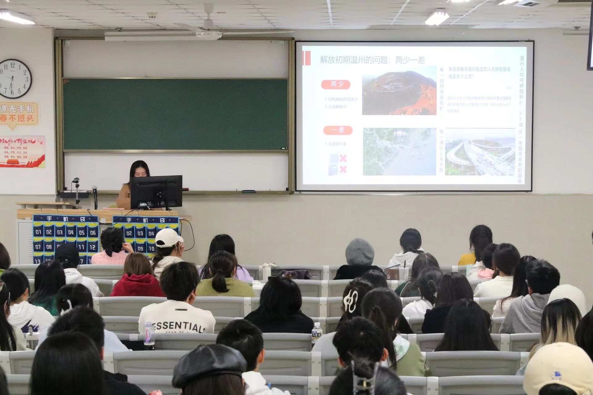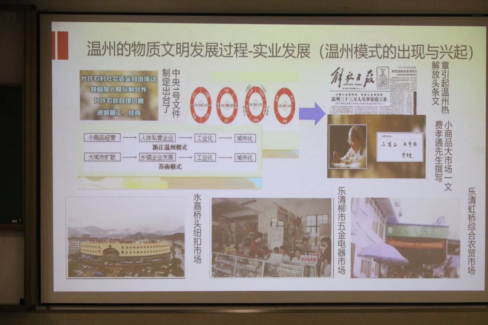 其次主讲人介绍了温州物质文明发展的两个过程。近代温州实业的发展可能并不那么风光,走私、偷渡,这些在当今违法的行为让温州迅速积累了财富。同时温州现代化发展中也遇到了种种困难。首当其冲的就是信任危机,由于温州商贩大量出售假鞋,一时间温州鞋被冠上了假冒伪劣的标签,不过奥康集团一把火烧光2000余双假鞋的举动,把温州从信任危机中解救了出来。