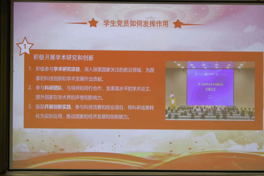 最后,主讲人指出作为学生党员的我们积极参与学术研究项目,深入探索国家关注的前沿领域,为国家的科技创新和学术发展作出贡献。参与科研团队,与导师和同行合作,发表高水平的学术论文,提升国家在学术界的声誉和影响力。鼓励开展创新实践,参与科技竞赛和创业项目,将科研成果转化为实际应用,推动国家的经济发展和创新能力。参与国际交流和文化交流、主动承担社会责任和公民意识、关注国家重大项目和倡议、培养领导力和影响力。