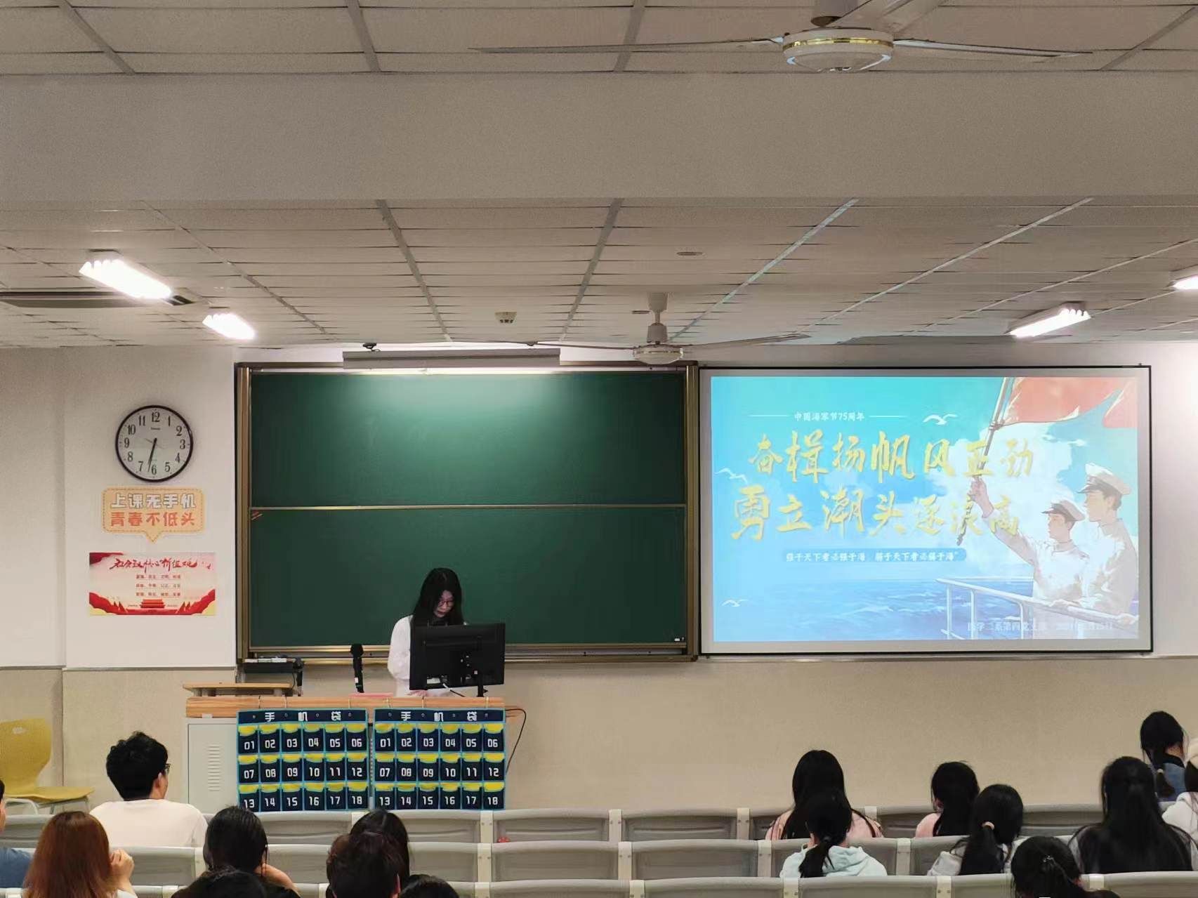 2024年5月15日,党建服务与人才培训中心在滨海校区1301教室和2101教室开展了主题为“奋楫扬帆风正劲,勇立潮头逐浪高”的一周看时事活动。主讲人分别从“锚”定忠诚、“舰”证时代、胜战航迹、和平乐章、时刻铭记、传承延续六个方面进行阐述。