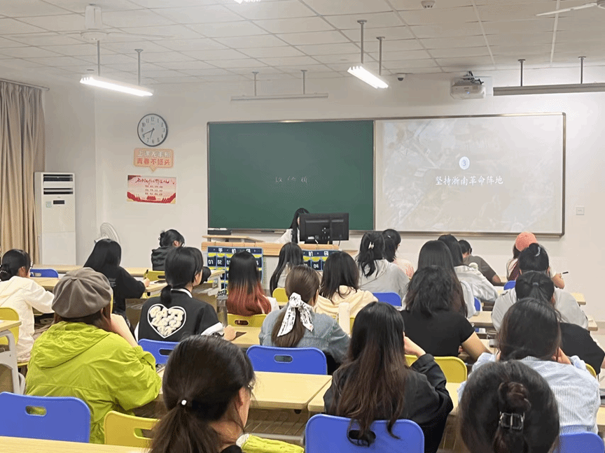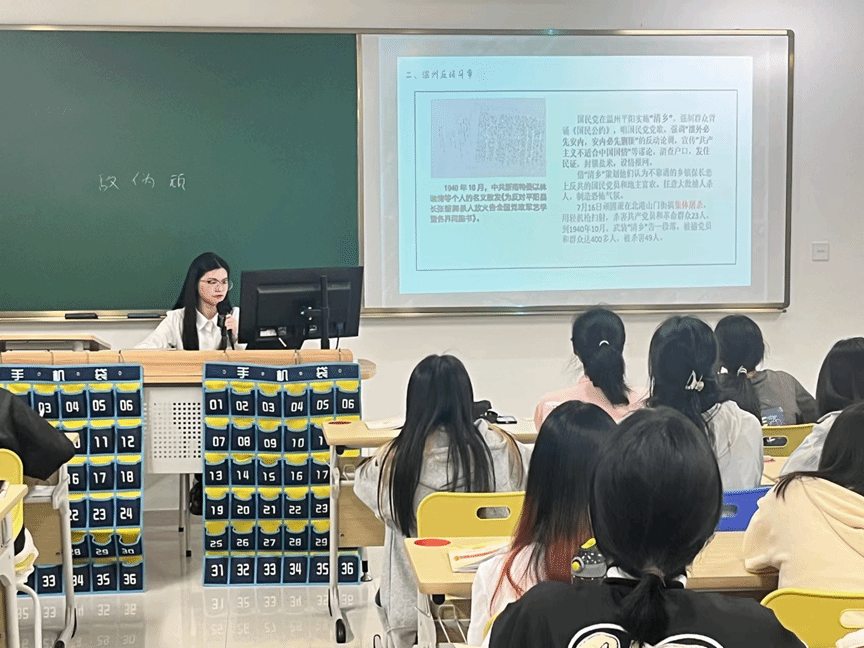 吴银仪同志以“隐蔽精干,蓄力以待坚持浙南革命根据地”为主题,“隐蔽精干”是指对敌军展开瓦解工作以及对伪军争取同情分子控制两面派,坚决打击作恶分子。对国民党顽固派实行自卫反击并牢记中国共产党的历史使命,在抗日战争这个民族危亡的背景下,中国共产党以隐蔽精干的精神牵制了日军大量的兵力,坚持了长期抗战,发挥了中流砥柱的作用,吴银仪同志为我们解说温州革命斗争时用词干练,在座的同学们仿佛都被代入了那段峥嵘岁月,回忆起浙南共产党反击帝国主义侵略者和国内反动派的事迹,更加坚定了理想信念。