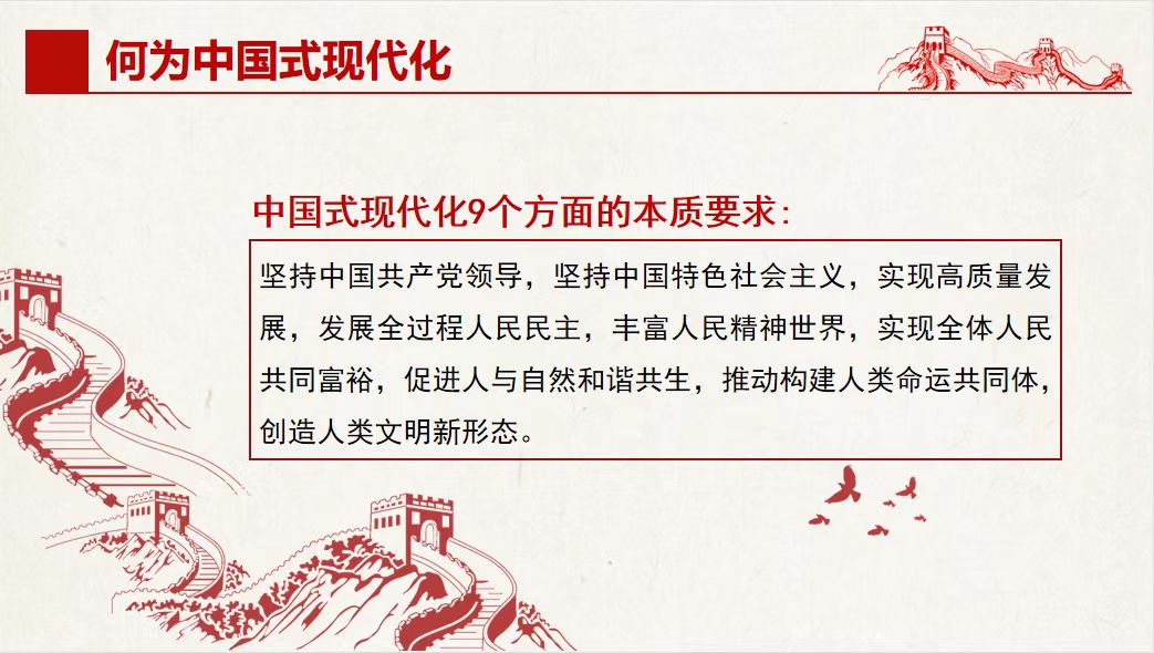 主讲人王古月同志首先向大家介绍了什么是中国式现代化。中国式现代化是人口规模巨大的现代化,是全体人民共同富裕的现代化,是物质文明和精神文明相协调的现代化,是人与自然和谐共生的现代化,是走和平发展道路的现代化。中国式现代化,它是中国人民在长期摸索中所形成的一种可持续的健康的发展模式,它不仅为中国自身发展指明了方向,更为其他国家的社会发展提供了可借鉴的模式。