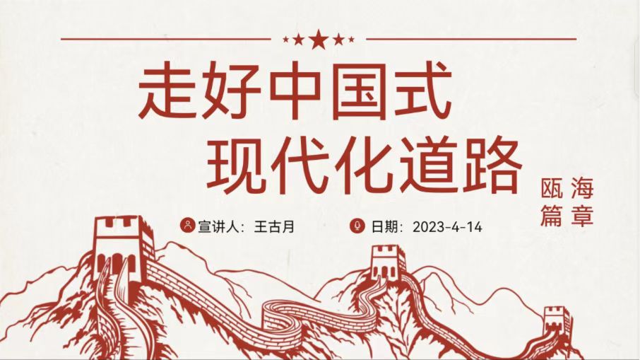 为了增进我们对瓯海现代化有进一步认识,党建服务与人才培训中心于2023年4月14日晚18:30于茶山校区求新楼105教室开展了以“走好中国式现代化道路”之瓯海篇章为主题的高峰论坛活动。主讲人王古月同志从“何为中国式现代化”“瓯海的现代化历程”“瓯海的跨越式蝶变”三个部分了解瓯海的现代化历程。