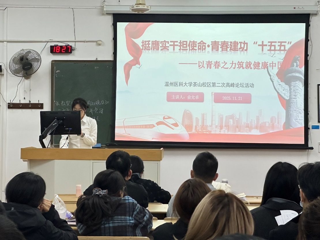 为了使同志们充分了解青年在“十五五”计划中可以发挥的力量,党建服务与人才培训中心于2025年11月21日晚18:30于7D103开展了主题为“挺膺实干担使命·青春建功'十五五'”的高峰论坛活动。主讲人俞允卓带领大家一起探讨:如何以青春之力筑就健康中国。