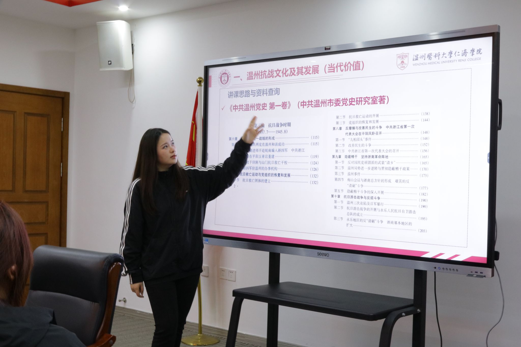 随后,主讲人和团队学员针对本学期的开课主题展开交流讨论。主讲人分享了两个党史相关的选题方向,讲解选题涉及的相关概念和历史事件,学员针对选题进行充分交流探讨。主讲人指导学员正确使用知网、共产党员网等优质网络资源进行文献查询,并分享了《中共温州党史 第一卷》等史料书籍供学员学习和备课。