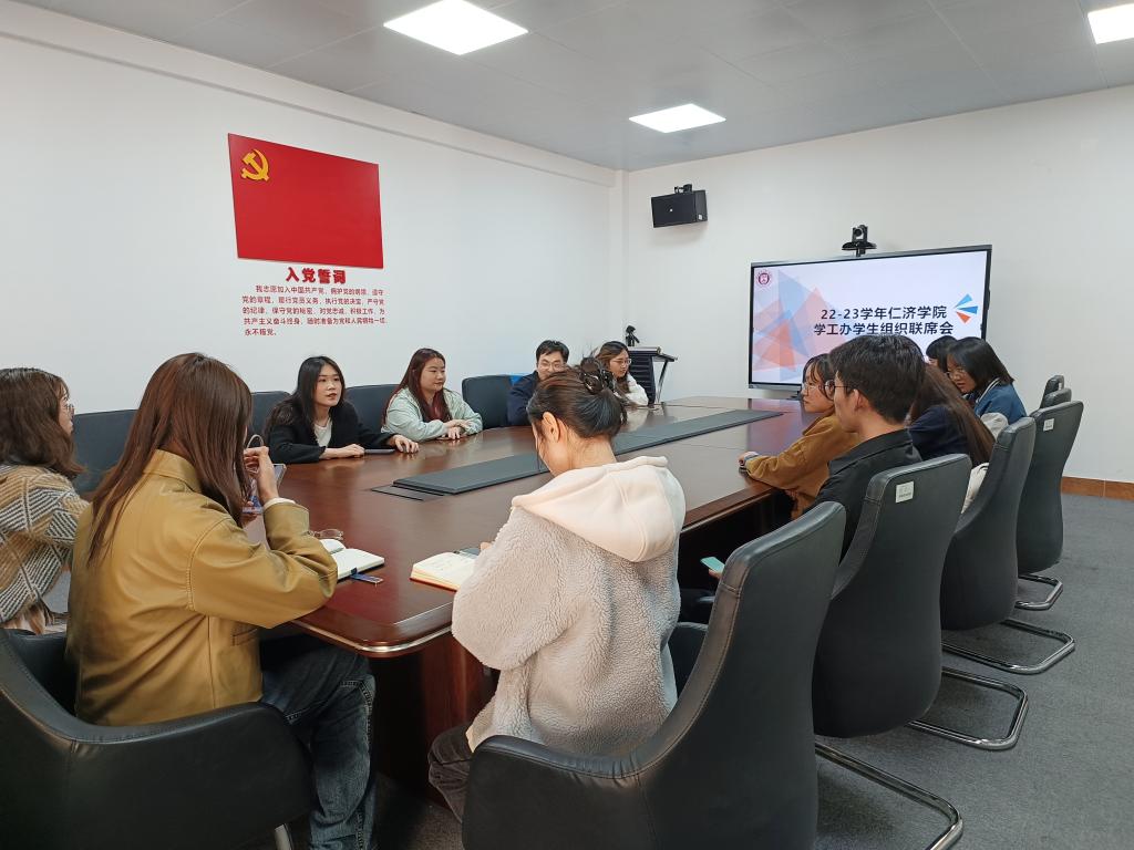 近日,学院学工办主任季子正主持召开学工办指导的学生组织联席会,结合学院特色,把握学生需求,共同谋划新学期工作举措,各学生组织指导老师陈若敏、郭俏俏、林洁、董新新,以及主要负责学生参加会议。