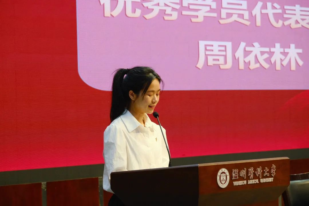 优秀学员代表周依林上台发言。她表示:人生如屋、信念为柱,只有坚定的理想信念,才能支撑一代代青年,为人民、为国家、为民族前赴后继地努力奋斗,作为新时代青年,必须坚定理想信念、树立奋斗意识、永保奋斗精神,用奋斗和奉献助力中华民族伟大复兴。