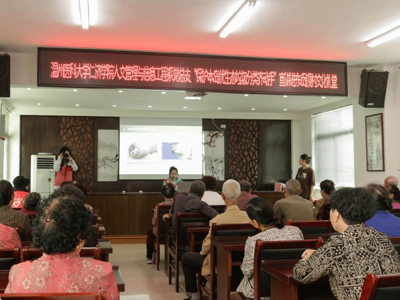 “爷爷奶奶们看看这四个不同颜色垃圾桶,绿色厨余垃圾分出来,蓝色可回收物卖出去,红色有害垃圾单独放,灰色其他垃圾无归类”,一场别开生面的“保护本岛优生态,垃圾分类齐动手”宣讲会由此展开。“00后”志愿者们通过各类垃圾图片的展示以及通俗易懂小口号的教学,为当地来自老年大学的爷爷奶奶们介绍了什么是生活垃圾、生活垃圾的危害、垃圾分类的准则等。志愿者在讲台上讲得绘声绘色,爷爷奶奶们在台下坐姿端正、认真听讲。