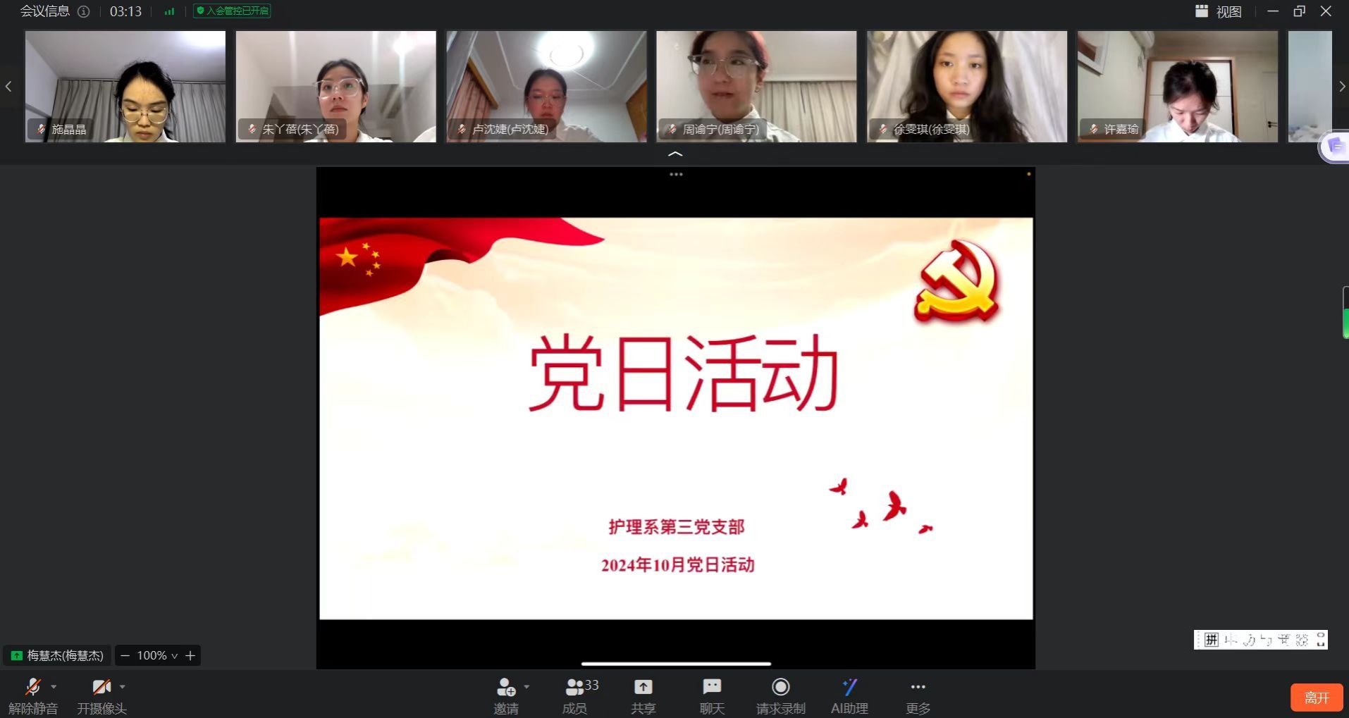 为促使支部党员学习《中国共产党不合格党员组织处置办法》中与党员相关的条款,对文件中规定的不合格情形做到心中有戒律,行为有尺度。2024年10月27日晚上21:00,护理系第党支部开展月主题党日活动。本次主题党日活动采用支部同志逐一发表学习感悟和心得体会的方式开展,由支部书记汪玲玲老师主持。