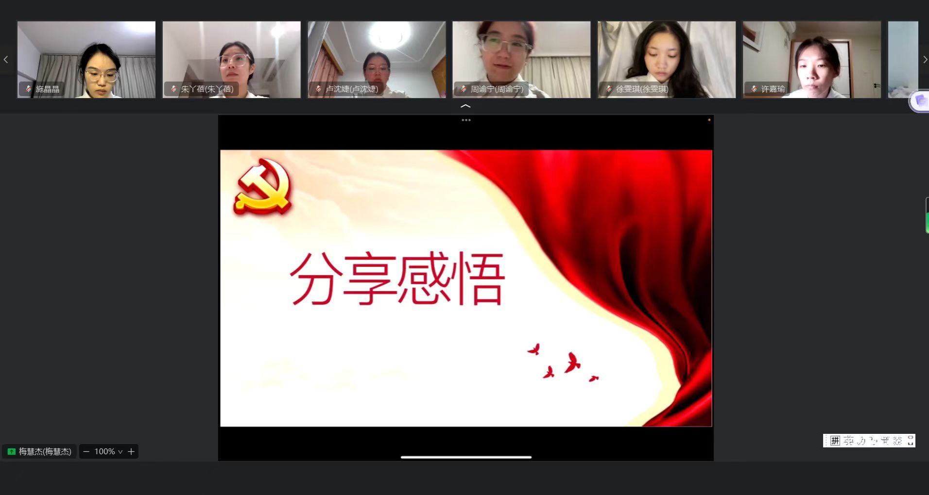 随后,主持人带领我们学习《中国共产党不合格党员组织处置办法》。它是一部专门就不合格党员组织处置作出规定的党内法规,是提醒党员自我监督、自我管理、永葆党员底色的重要措施。在此次会议上,各位党员同志都分享了对于《办法》的感悟体会,纷纷表示自己虽然在外实习,但不断加强党性修养,要将《办法》作为自己时刻遵循的行为准则,在日常生活中保持清醒的头脑遵守党的各项规章制度对标不合格党员的情形,严格自律,反思自身存在的问题,有则改之无则加勉不断提高自身的政治觉悟同时端正入党动机,坚定理想信念,对党忠诚在工作中认真严谨,勇于担当,主动作为,与群众良好沟通,密切联系群众,尽己所能帮其排忧解难,积极向党组织靠拢在行动上与党组织紧密相连,采取实际行动去筑牢纪律防线切实做到理论联系实际,尽自己所能服务人民、服务社会起先锋模范作用。