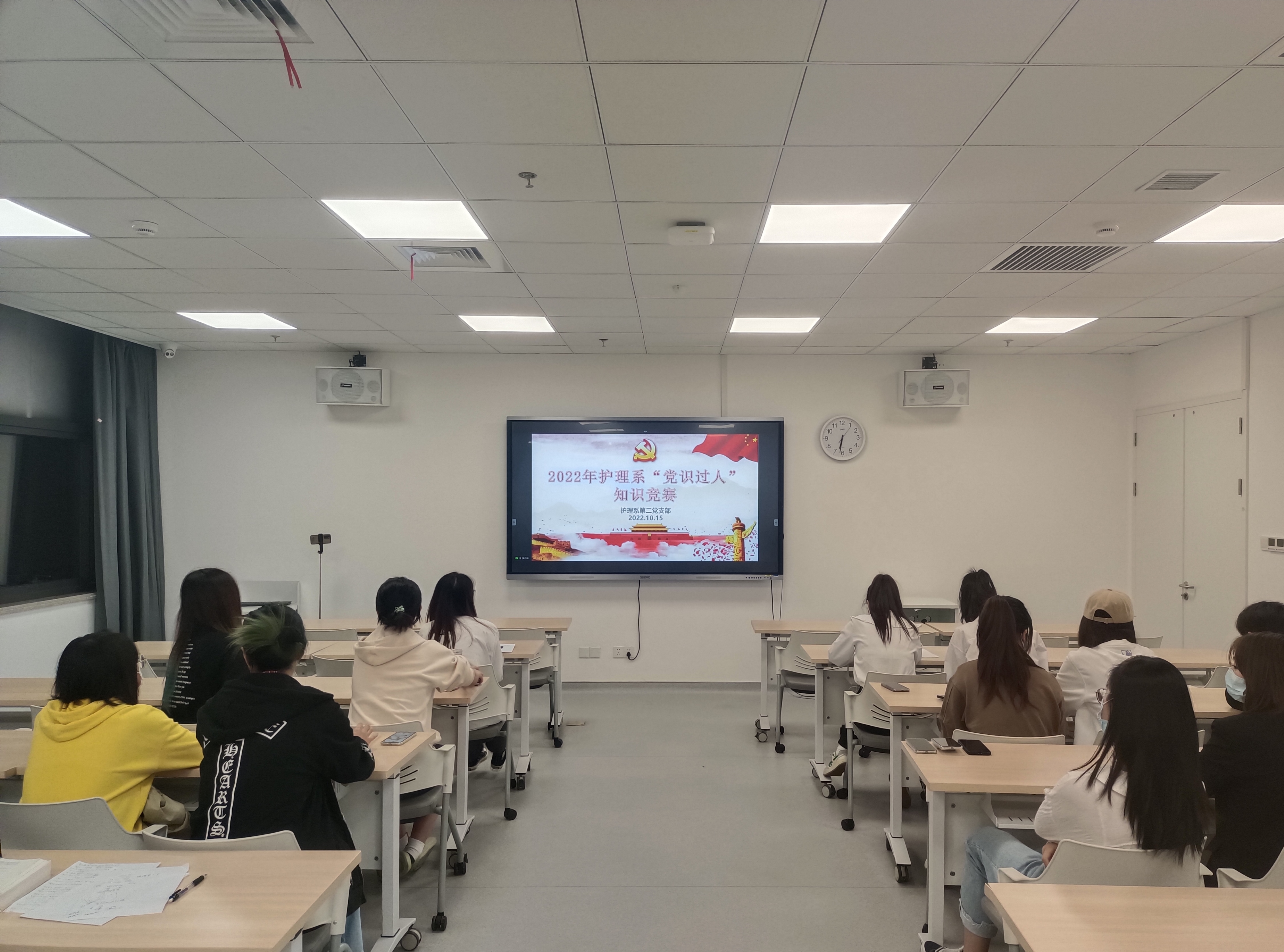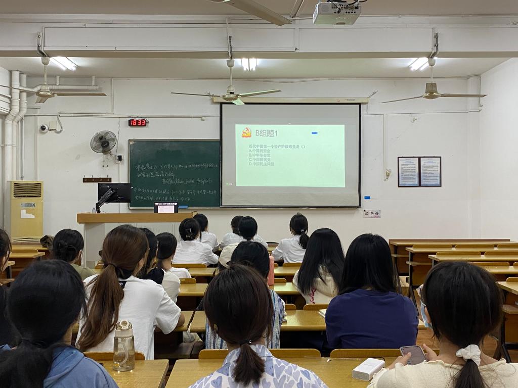 为迎接党的二十大胜利召开,推动党史学习教育,检验党史学习教育成果,av解说 护理系第二党支部于2022年10月15日18:30在茶山校区7c107教室和钉钉线上举行“党识过人”知识竞赛。本次竞赛共有三个环节,三轮比赛,共有五个小组参赛,由黄丹榕同志主持。