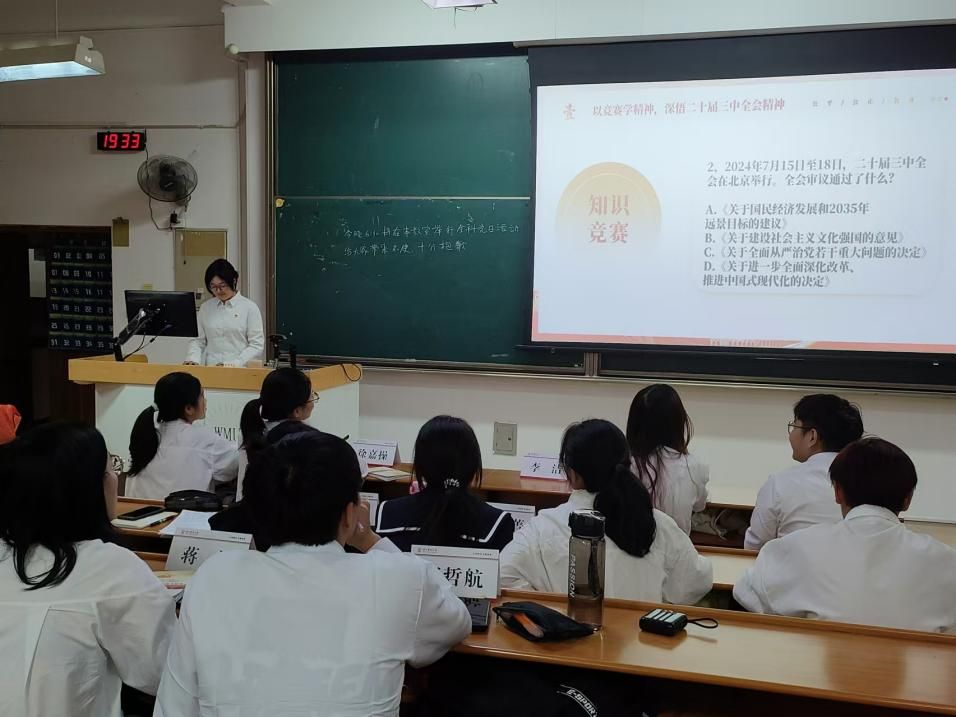 10月29日晚18:30,av解说 医学一系第一党支部于茶山7AJ101教室开展了以“深入学习党的二十届三中全会精神,强化党纪学习教育”为主题的党日活动,旨在深化党员的理论学习,提升党性修养,本次党日活动应到21人,实到20人,1名同志请假,会议由医学一系第一党支部书记田丹同志主持。