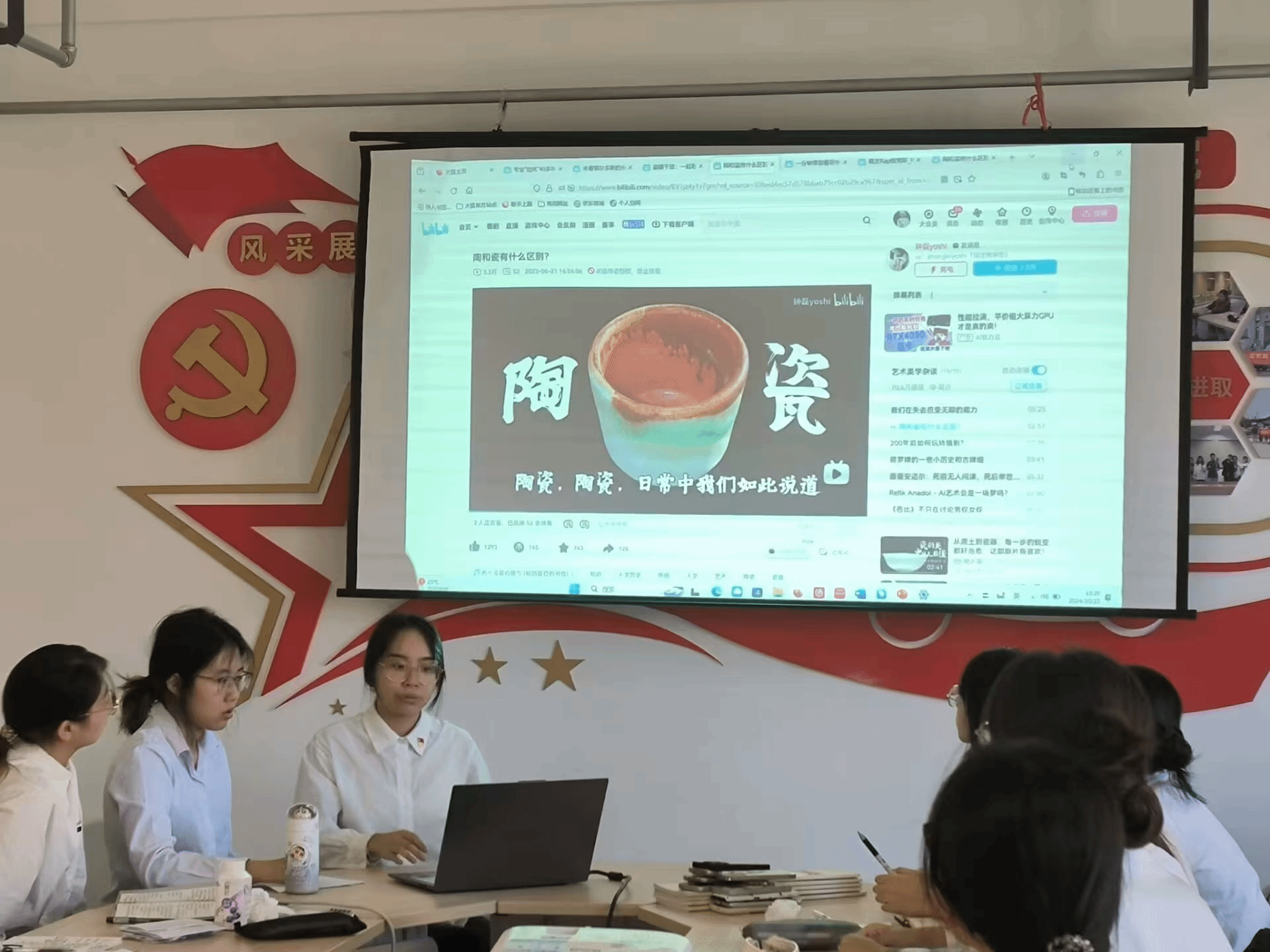 会上,第一小组以“创新引领,绿造未来”为主题,讲述光伏发电的起源、必要性和创新点,点明光伏发电作为绿色能源的璀璨“明星”,正以创新之力重塑能源版图,为地球披上绿装。光伏发电不仅缓解了化石燃料之急,还引领着未来发展的潮流,彰显了绿色发展理念。青年一代需明白创新是引领发展的第一动力,不断深化绿色科技研究,积极参与社会公益活动,增强公众环保意识,共同守护地球家园,共创一个更加清洁、明亮的明天。第二小组以“瓷器为窗笼,聆听文化秘语”为主题,带领同志们学习瓷器的起源和发展历程,讲述了陶与瓷的区别主要在于温度、击打的声响和表面光滑程度,强调瓷器作为中华优秀传统文化瑰宝与中华文明发展密不可分。瓷器的每一抹色彩、每一缕纹饰,皆承载着厚重的历史与文化。作为大学生,我们自身要积极关注瓷器文化的传播与交流,利用社交媒体等平台,向世界展示中国瓷器的独特魅力,促进不同文化之间的相互理解和尊重,让瓷器艺术在新时代焕发新的光彩,成为连接过去与未来的桥梁。