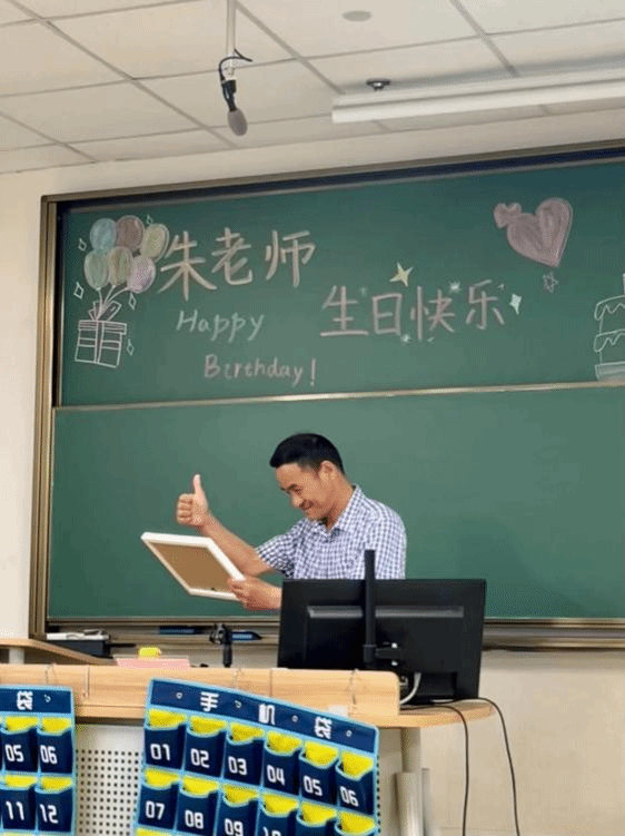 当朱老师踏进教室,同学们迫不及待地向朱丰根老师献上由学生亲手绘制的画像和贺卡。看到那张满载全班心意的贺卡与精致的画像时,朱老师脸上绽放出灿烂的笑容,他深深感受到了同学们的真诚与关爱。朱丰根老师不仅在教学上严谨认真、深受学生喜爱,更以勤俭朴素、平易近人的品质赢得了同学们的尊重。