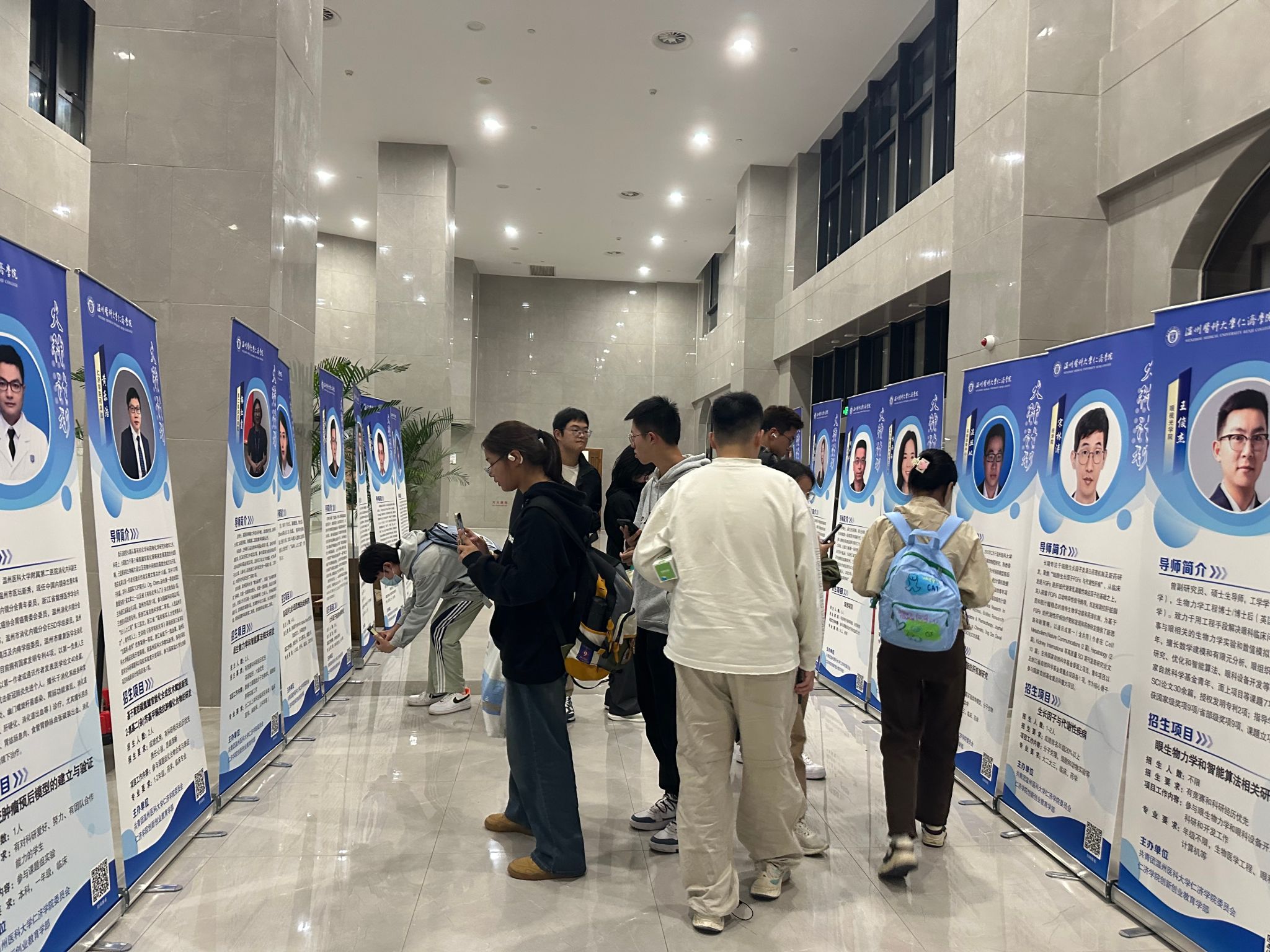 10月24日温医大滨海校区的报告厅前热闹非凡,300多名学生正驻足观看“火种计划”18位双创导师的简介情况,了解导师背景、研究项目和招生需求,同学们纷纷扫码报名,期待着自己能进入自己心仪的导师团队。
