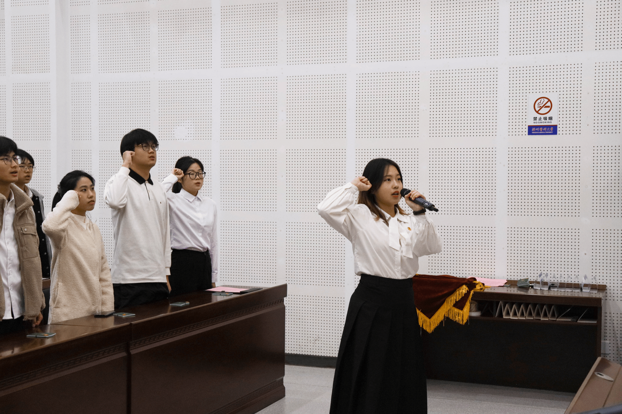 仪式在庄严的国歌声中拉开帷幕,全体师生肃立齐唱,展现出青年一代对党和祖国的深情厚爱与崇高敬意。学院团委副书记项珍飞宣读了新团员名单,由学院团委书记王翩翩、团委副书记项珍飞为新团员佩戴团徽、颁发团员证。