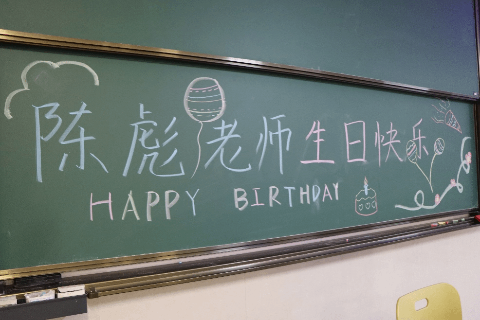 当晚课程开始前,院学生团委的工作人员提前来到教室,精心布置出温馨的庆生氛围。黑板上“陈彪老师生日快乐” 八个字格外醒目,旁边点缀着手绘的小气球与小礼炮图案,色彩明快、充满童趣,每一笔都饱含着对老师的敬意与祝福,让原本严肃的教室瞬间充满了欢乐与暖意。