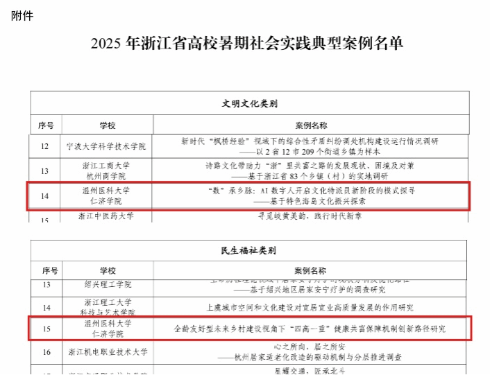 近日,共青团浙江省委、中共浙江省委宣传部、浙江省教育厅、浙江省学生联合会联合印发《关于公布2025年浙江省高校暑期社会实践典型案例的通知》,经全省广泛征集与严格遴选,学院两项实践案例成功入选省典型案例,展现了av解说 学子在社会实践中扎根基层、锐意创新的优良风貌与青春担当。