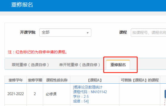 通过查询课程代码或名称(成绩查询界面查看即可)找到自己要报名的课程,在该课程最右边点击“报名”,重修考试时间统一选择“期末考”,如遇重修课程考试和正考时间冲突,需携带重修通知单在规定时间内到教务处将考试时间变更为下学期期初考试,具体期末重修改期初事宜另行通知。报名后可以点击右侧黄色长条框“重修报名信息”查看已选课程。报名期间如要退选课程,必须在缴费前点击已选课程右边红色“退选”按钮进行退选。