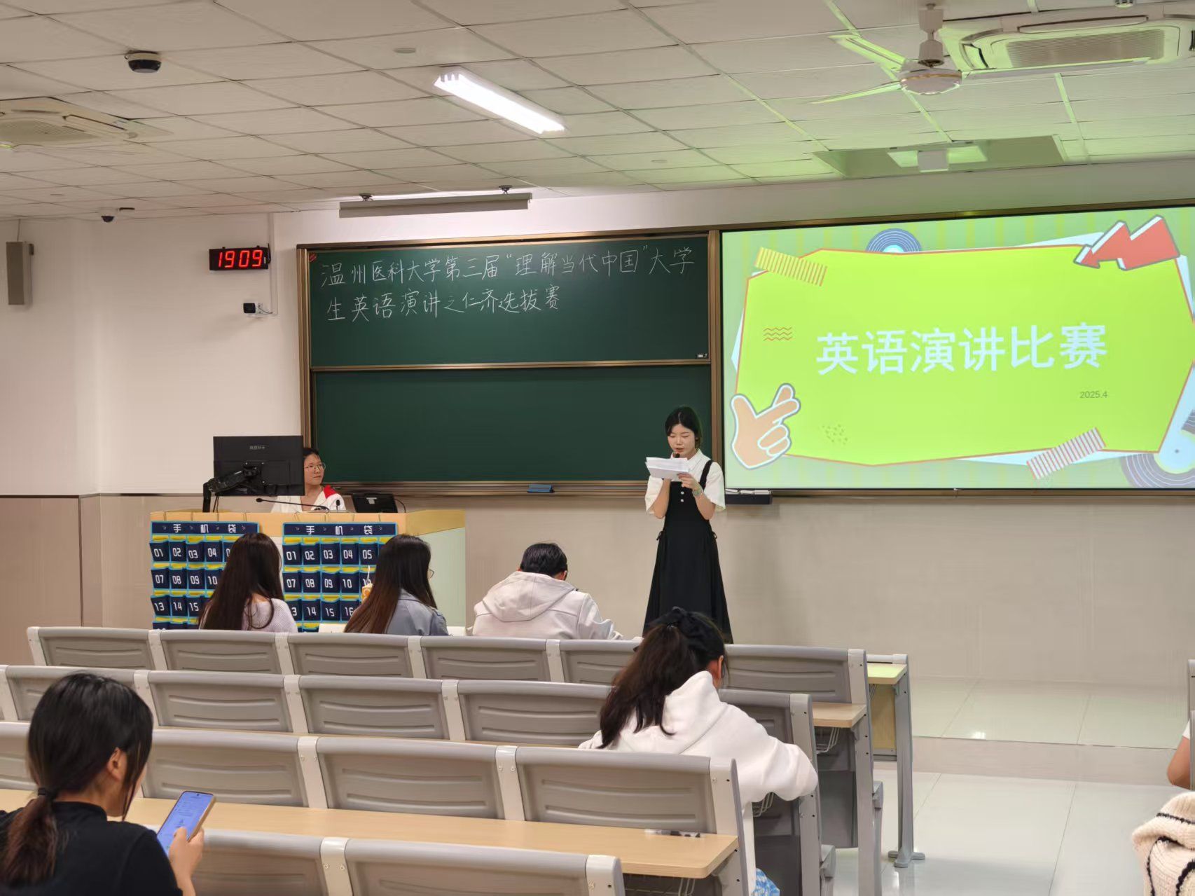 夏海鸥老师做点评发言,她对选手们的精心准备和精彩表现给予充分肯定,并从演讲内容、语言表达、发音与语调、台风表现等方面对参赛选手进行了全面的点评。寄语参赛选手"在这个百年变局的浪潮中,每一位仁济学子都是中国故事的书写者,期待你们用专业与语言的双桨,在世界的海洋中破浪前行!"