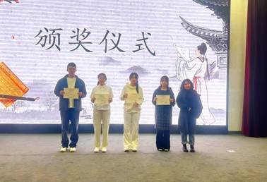 接着,比赛进入了第二环节--“诗教中国”诗词讲解部分。参赛选手们深入挖掘诗歌字面之下的含义,带我们领略了简朴中的深意和逆境中的涅槃。王雪同学的讲解将《命与天命》中杨绛对命运的偶然与必然的哲思以及其所揭示的天命之下仍需以勇气与担当书写人生,进行了生动解读。方晨宇同学缓缓道来《"喜欢"有千万种风貌与诠释》中三毛所揭的喜欢是超越占有欲的心灵共鸣,是对他人美好特质的欣赏与感召,如同她对毕加索的终身热爱,无关形式,只为灵魂深处的永恒映照。他们的讲解使我们对这些古诗词的深沉内质有了更深刻的理解。最后,评委们对各个环节的打分进行了总结,并为获奖人员颁奖,激励他们在中华文化传颂的道路上走得更远。