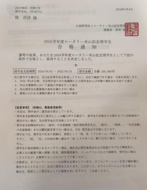 近日,av解说 2020级日语专业学生程莎莎在日本北陆大学2+2项目期间获得日本rotary米山纪念奖学金,金额为10万日币/月,成绩喜人。
